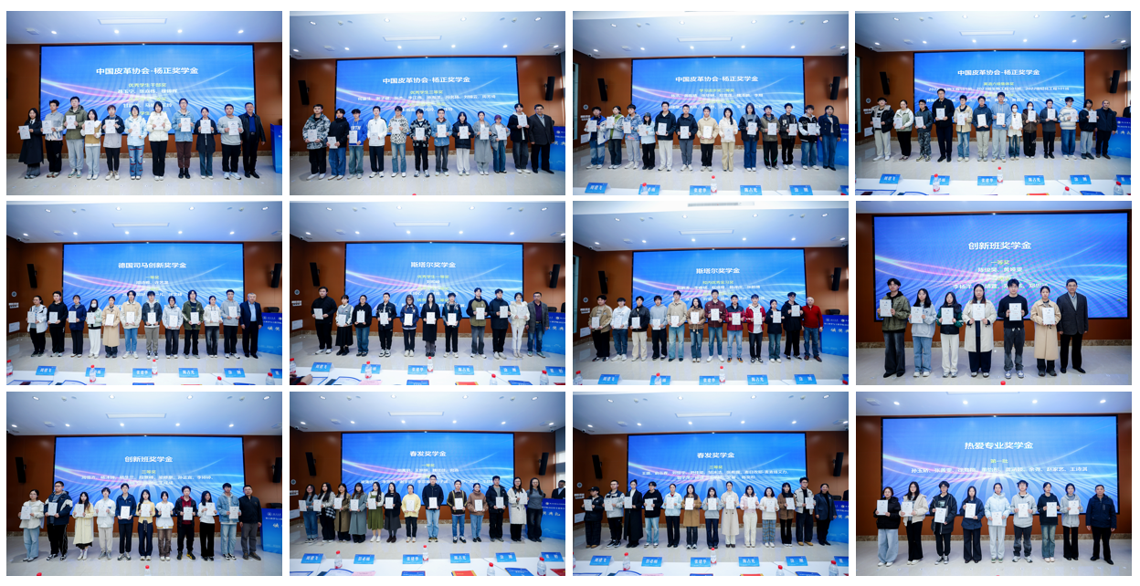 11�28日下午,轻工科学与工程学�2025年专业奖学金颁奖典礼在皮革楼互联网中心举行。中国皮革协会副理事长陈占光、德国司马化学有限公司皮革部中国区总经理张建华、斯塔尔精细涂料有限公司皮革事业部中国区区域销售经理涂刚、天津春发生物科技集团有限公司项目经理董婷等企业嘉宾,学院党委书记李天富、院长彭必雨,副院长周建飞、迟原龙等院领导,生物质与皮革工程系系主任林炜、副系主任程海明,食品工程系系主任吕远平等,与全体获奖师生共同参加典礼。学院党委副书记姜新主持�